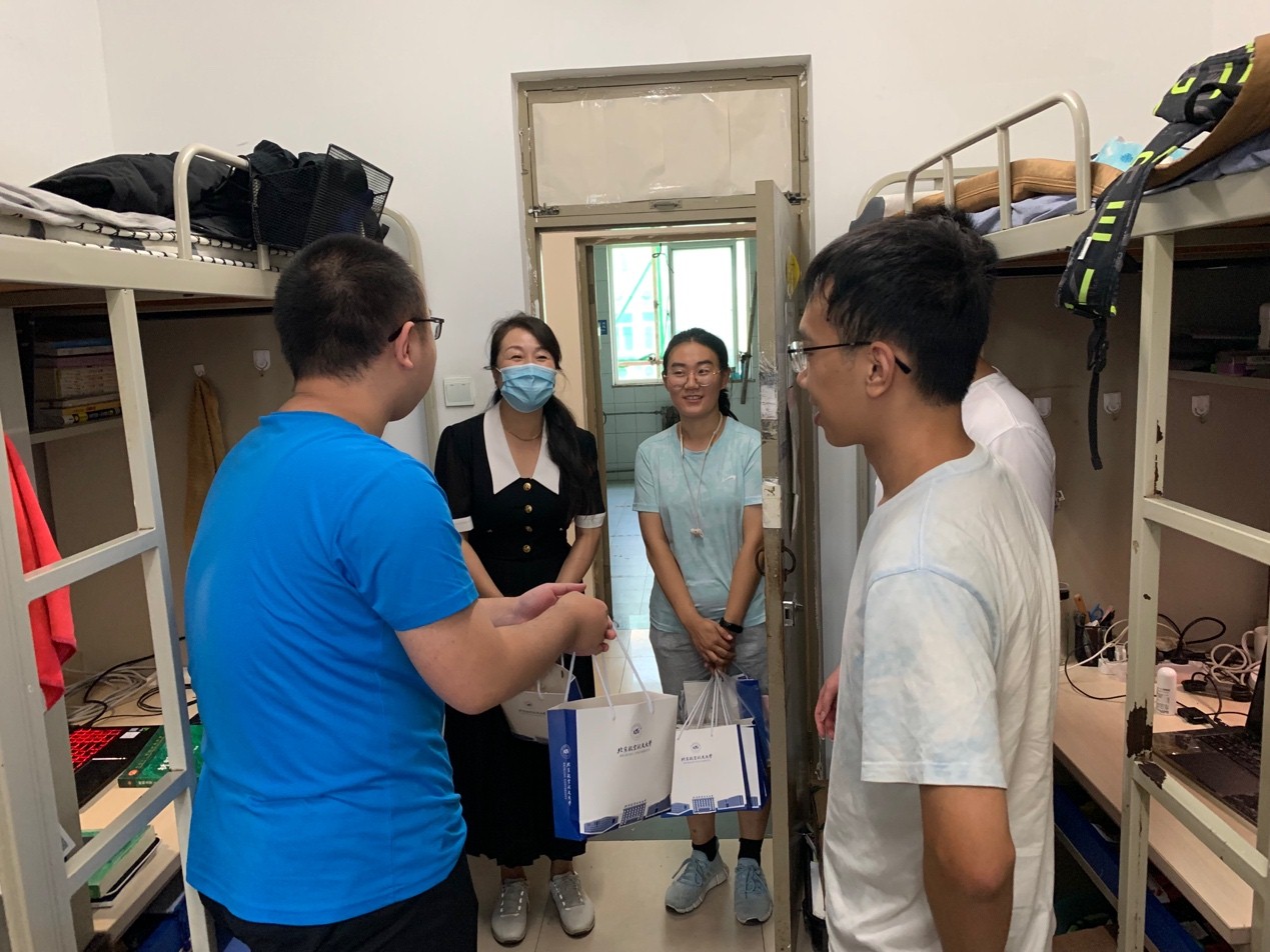 2022年9月8日下午,yl6809永利官网党委书记朱颖和副书记谷萌到学生宿舍看望同学们。朱颖书记亲切地询问同学们从沙河校区搬迁到学院路校区后是否适应新环境,学习、生活有无遇到困难。同学们表示较为适应新环境,新学期会高质量完成好课业学习和科研实践。朱颖书记也嘱咐同学们绷紧疫情防控之“弦”、珍惜时光、刻苦学习,并为同学们送去了北航定制月饼,祝同学们中秋快乐。