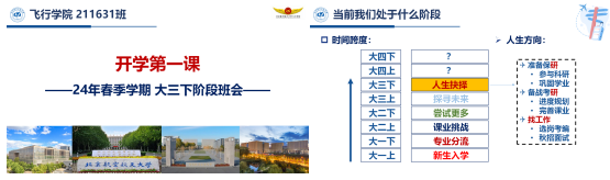 民航机务工程专业的班会从生活、作风、思想、学业规划等多个方面进行展开,针对不同年级给出相应提示和建议。并从同学们未来发展出发,针对其专业的独特性介绍可能的发展方向与相关信息获取渠道,对于考研同学进行考后心理辅导。最后开展大学生应征入伍宣传,鼓励广大同学投入到火热的强军强国建设中。